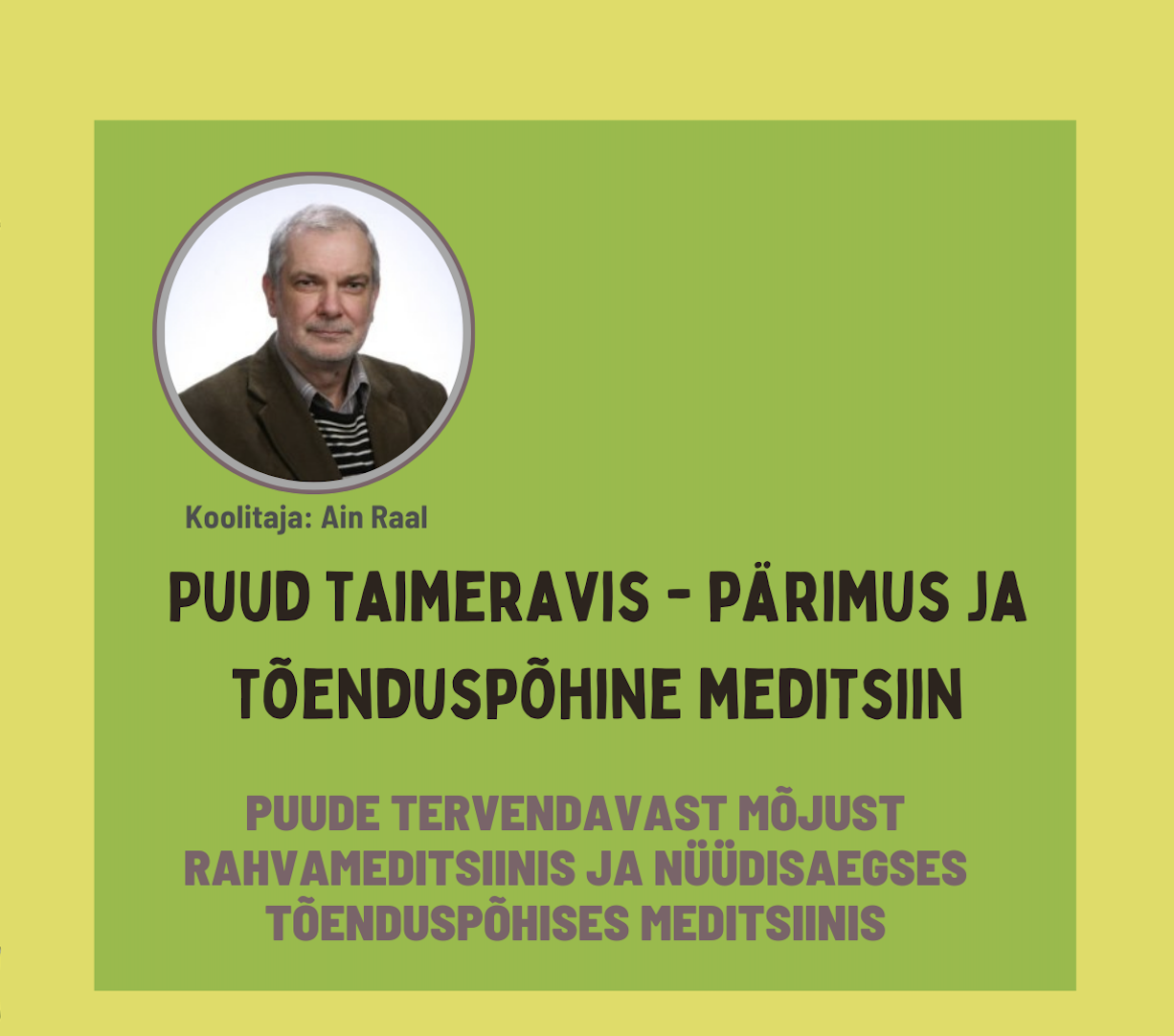 Selles loengus vaatame läbi 8 eestlastele hästi teada-tuntud puud, ja tutvume nende raviomadustega sügavamalt. Kõikide koolitusel käsitletavate puude kohta on palju infot leida nii kogutud pärimuses kui ka moodsa maailma teaduskirjanduses. Kas ja kuidas nende kahe maailma info kokku langeb? Kuidas kasutada kaselehti, millal on parim korjata kadakamarju, mis osa tammest on kõige suuremate raviomadustega, kas parem on männi- või kuusevaik, mis on pärna üllatavad raviomadused ning miks võiks pajukoor kõigil koduapteegis olla?